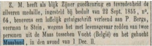 Peter Bergs huwde met Maria Catharina Schepers, geboren in 1809 te Stein. Hij kreeg in 1867 een zilveren medaille uitgereikt omdat hij twee personen had gered van de verdrinkingsdood.